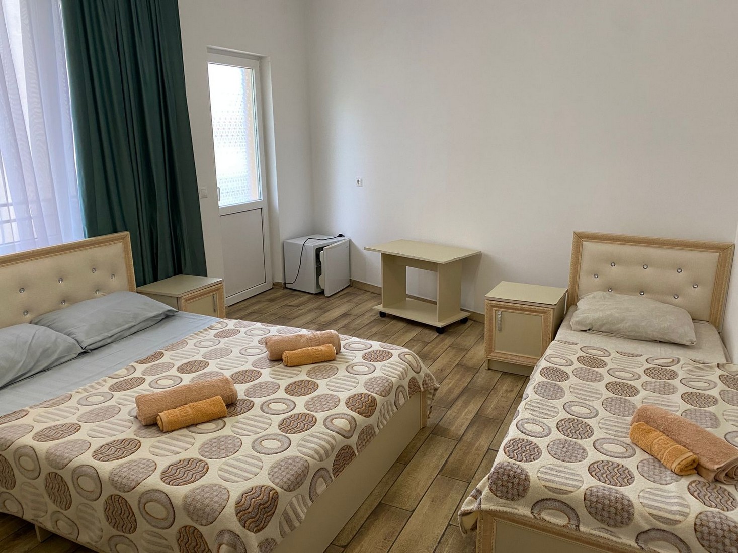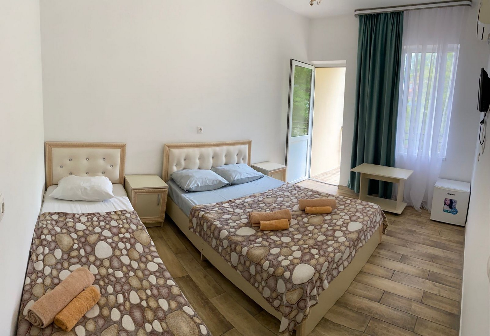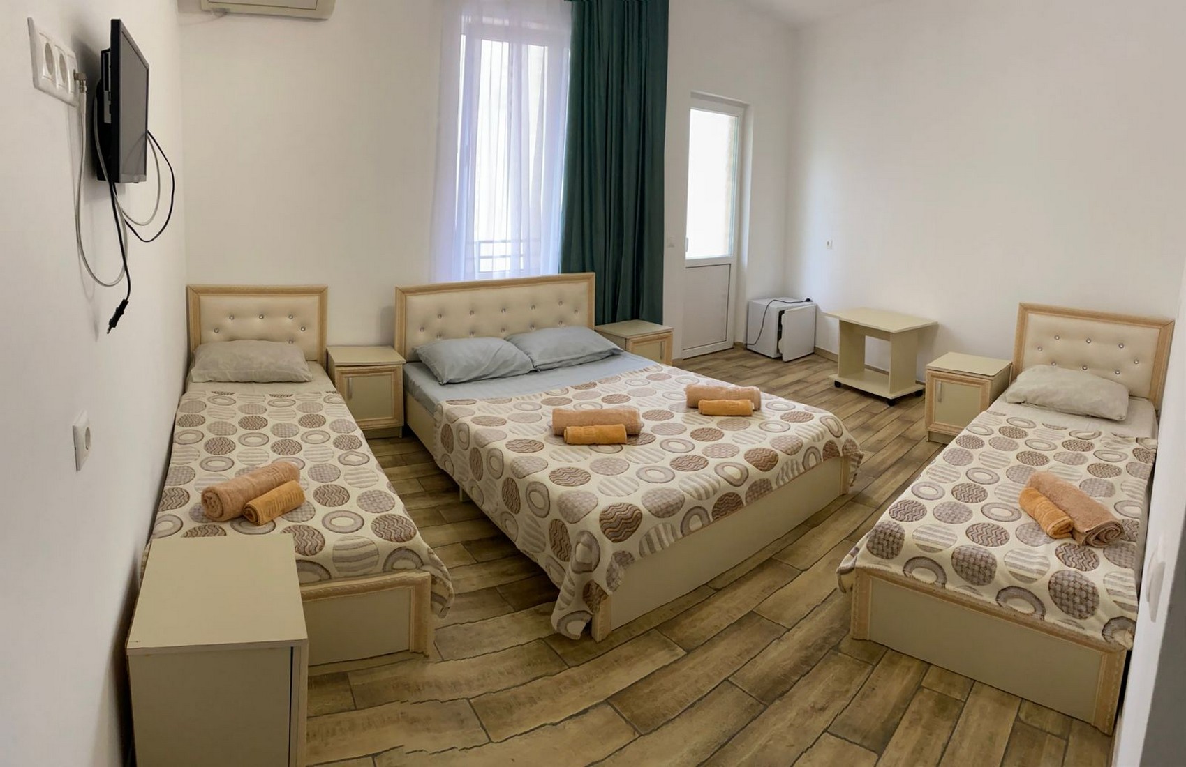 | Стандарт Стандарт 3-х местный | 18 кв.м. | 3 чел. | Балкон (с мебелью), Мебель (вешалка, зеркало, кровать двуспальная, кровать односпальная, стол, стуль... | |